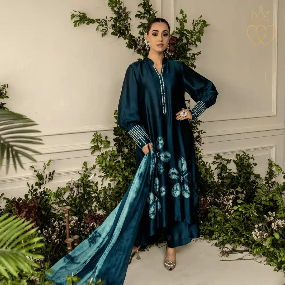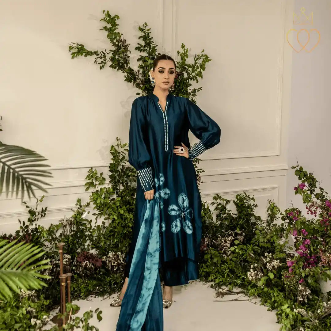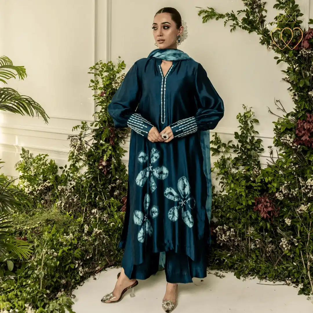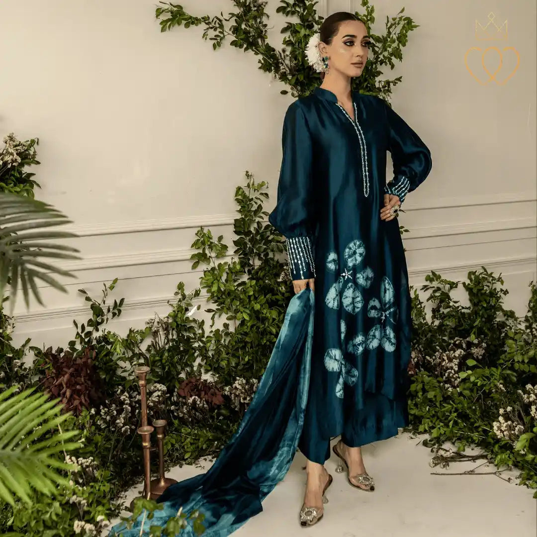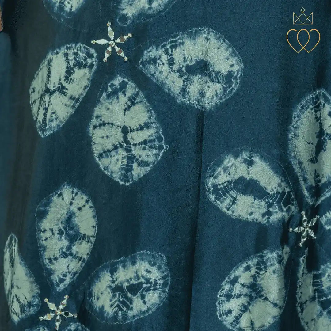 Cynthia embodies composed strength and quiet confidence. The mokume shibori floral motifs reflect organic growth and layered resilience, symbolising a woman’s journey shaped by experience rather than haste. The deep teal tones evoke depth, stability, and emotional strength, while the minimal hand embellishment reinforces elegance through restraint. This design represents women who lead with calm assurance, rooted in their identity and evolving with purpose.