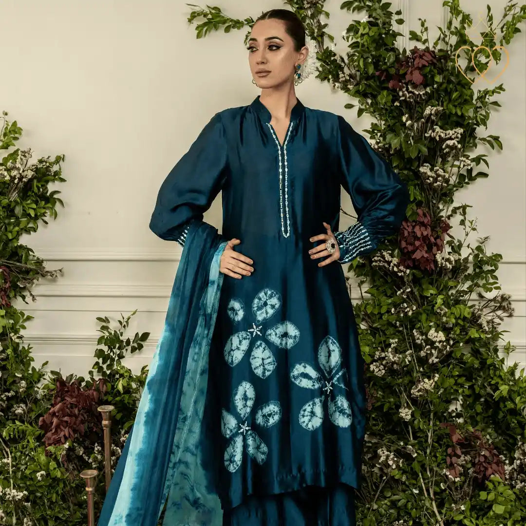 Straight-cut shirt featuring large floral mokume shibori motifs placed across the lower body, highlighted with subtle mirror accents at motif centers. Finished with hand embellishment along the neckline and densely worked shibori cuffs. Paired with a matching plain-dyed trouser and a contrast-dyed dupatta featuring coordinated shibori textures.